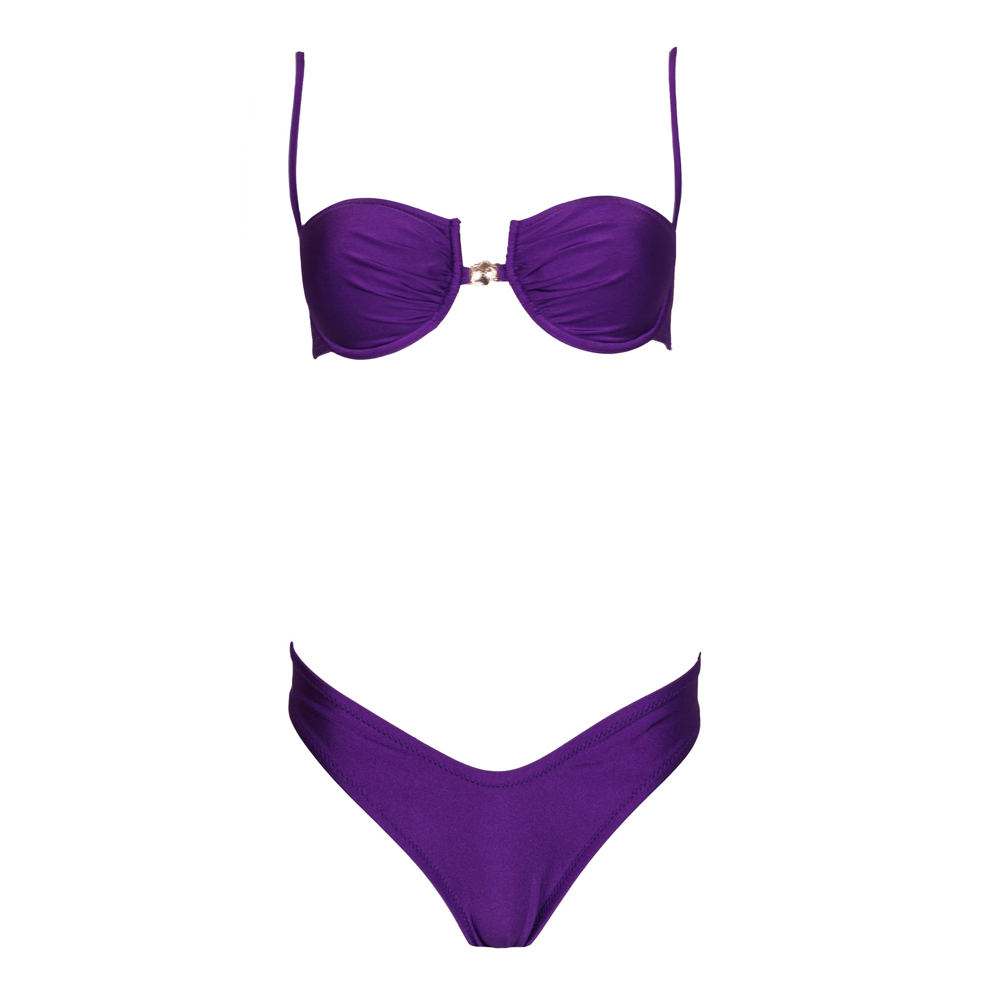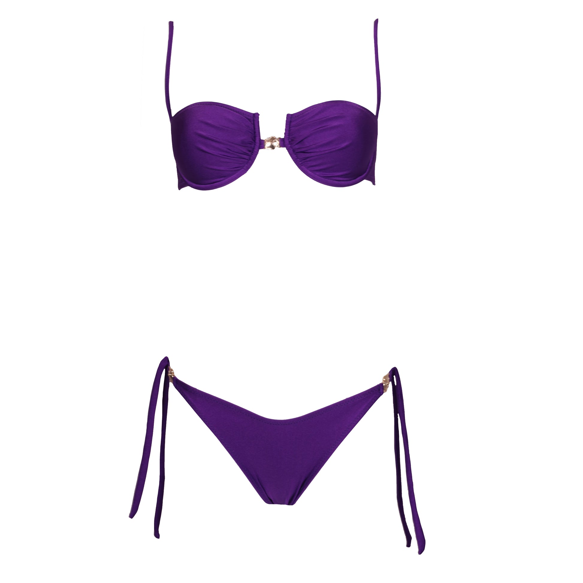 Balconcino tessuto seta, coppe estraibili, coppa drappeggiata, chiusura con fiocco alla schiena e applicazione di accessorio a centro seno.