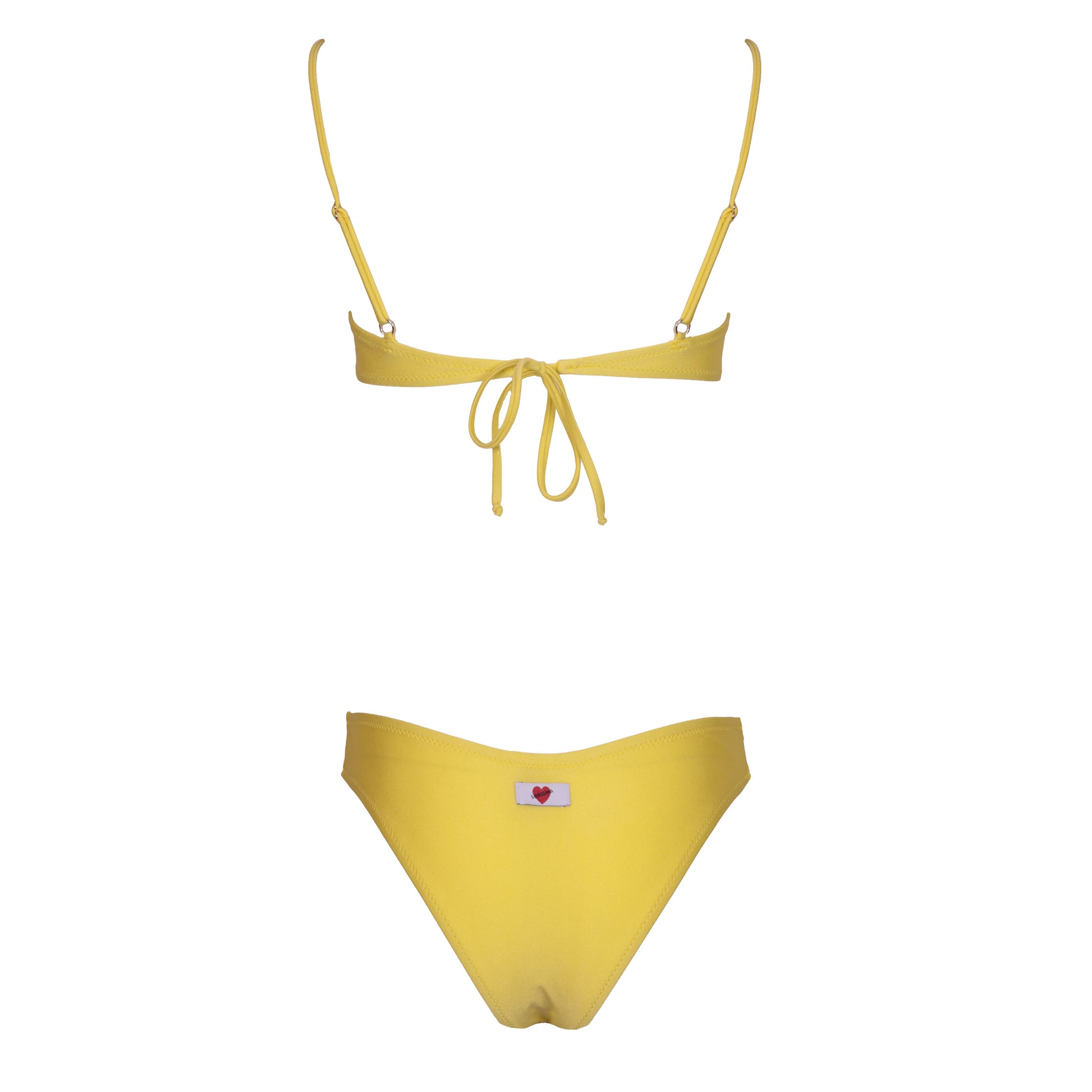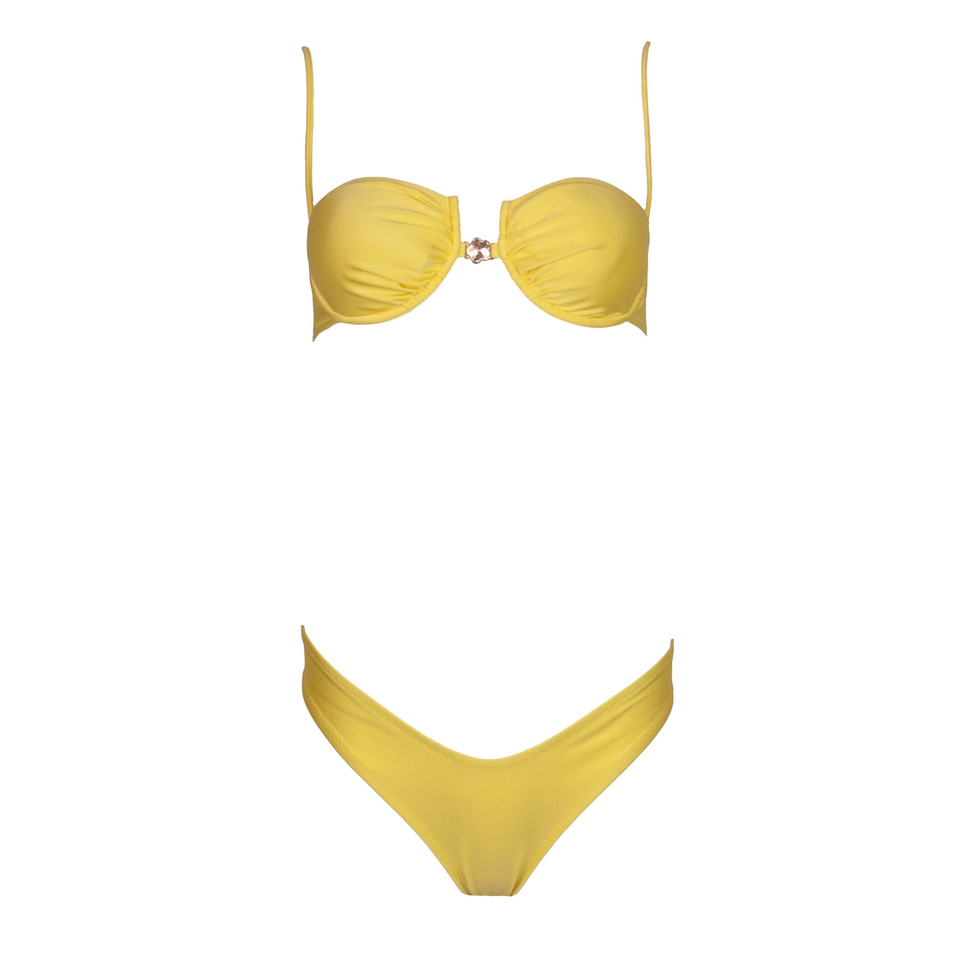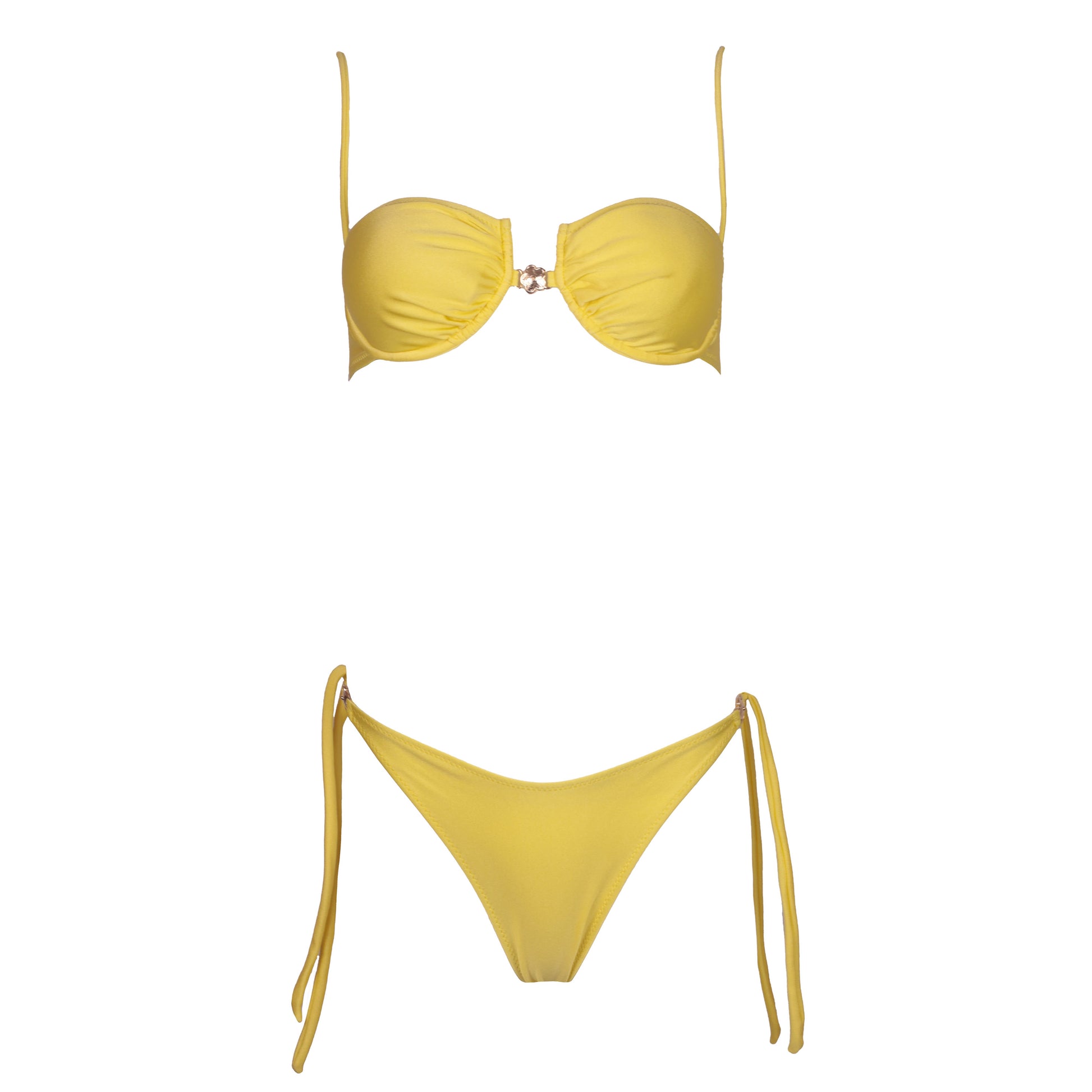 Balconcino tessuto seta, coppe estraibili, coppa drappeggiata, chiusura con fiocco alla schiena e applicazione di accessorio a centro seno.