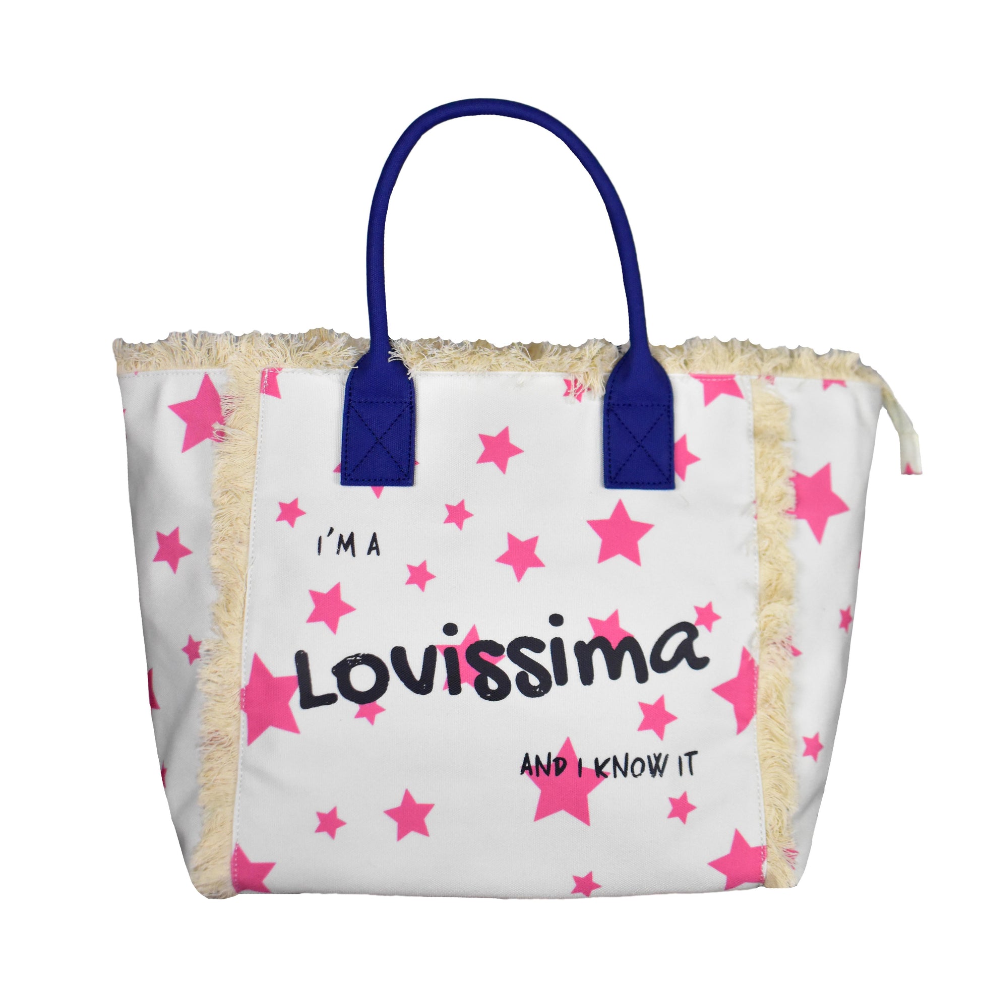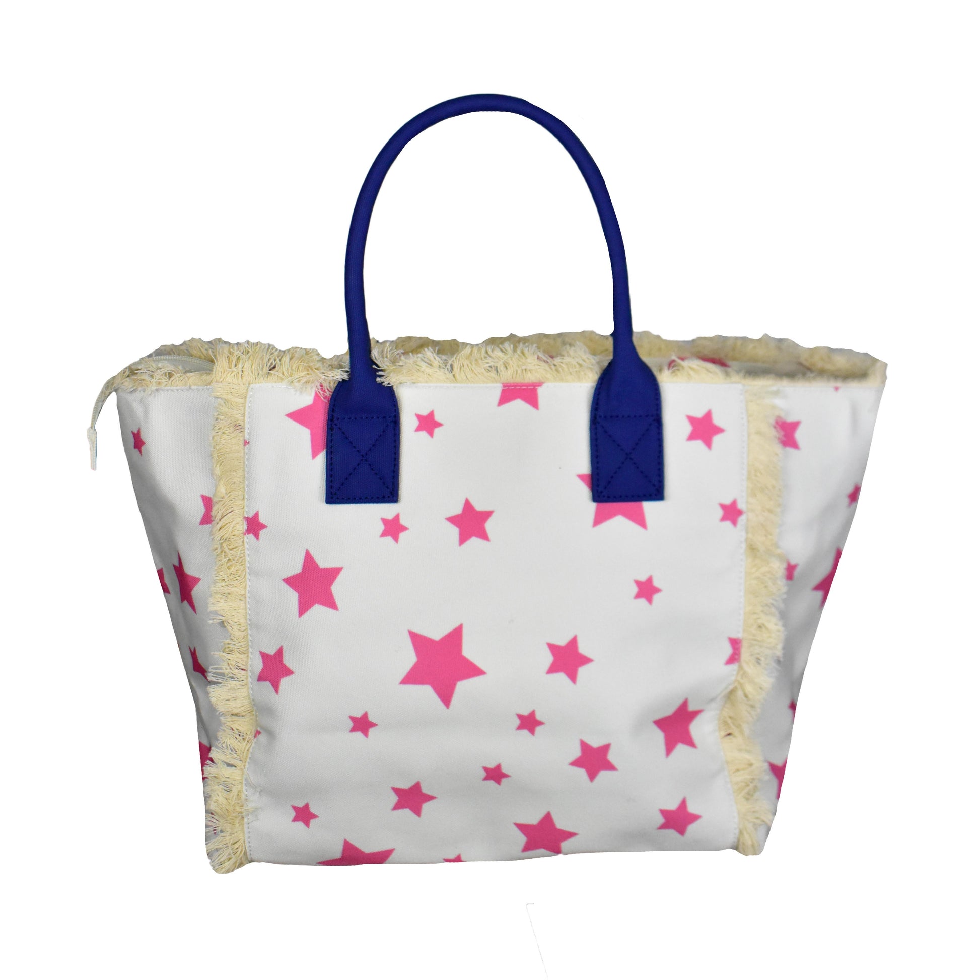 Multicolor, cotone, tinta unita, stampa con logo sul davanti, bordo con frange, due manici tondi, chiusura superiore con zip.